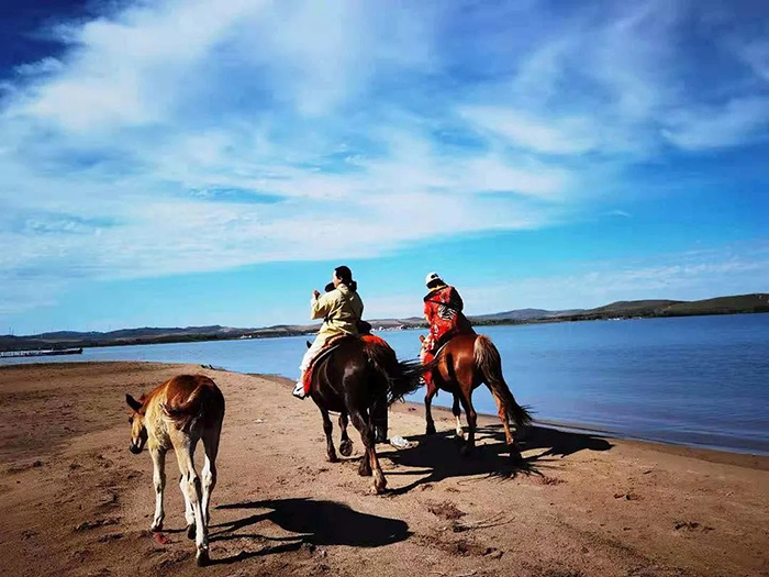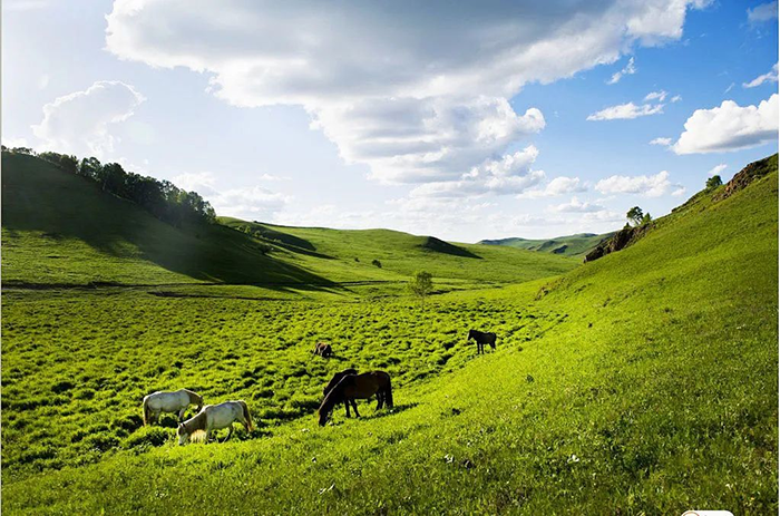 夏天的草原綠草如茵,深呼吸一口,清香的草木味撲鼻而來,讓人心曠神怡、如癡如醉。漫游在草原上,風(fēng)吹草動(dòng),形成了一幅如詩(shī)如畫的景象,正如北朝民歌“天蒼蒼,野茫茫,風(fēng)吹草低見牛羊”!騎在馬背上,悠哉游哉,仿佛進(jìn)入了世外桃源。